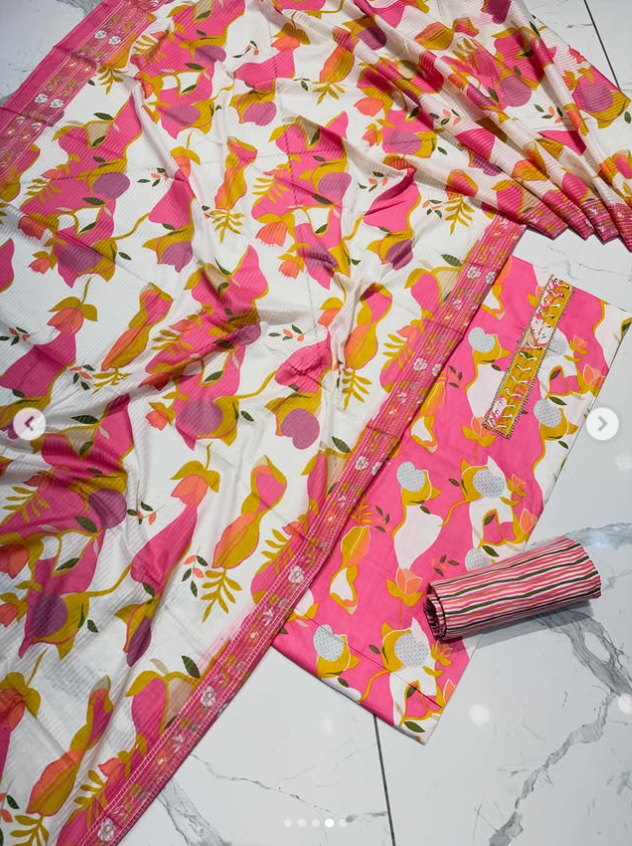 Design: Bold floral print on the dupatta and shirt, accented with a gold-toned embroidered border and a striped coordinate for the salwar/pants.
